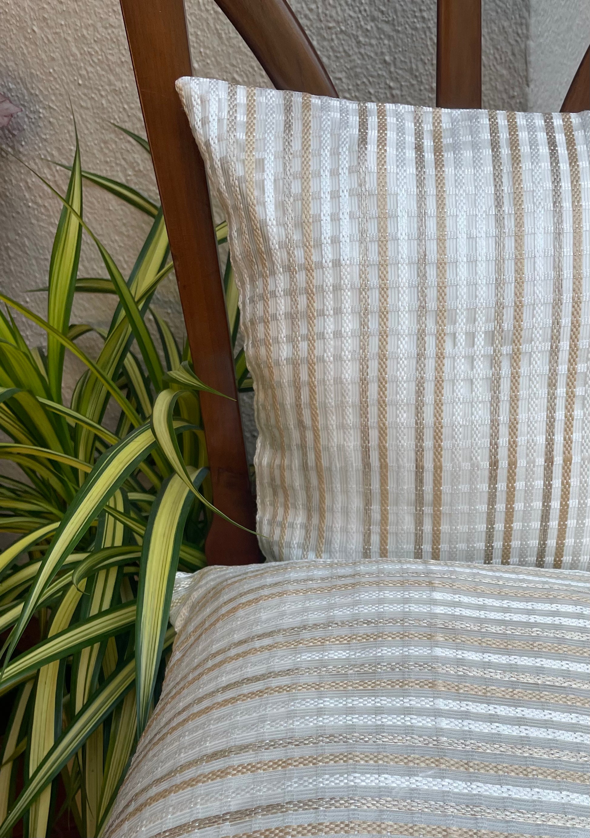 Elevate your interior with these sophisticated cushion covers, where premium silk threads are meticulously woven into delicate organza fabric. The understated brown and white stripe pattern delivers timeless elegance, striking the perfect balance between subtlety and visual impact. This set of two covers transforms any seating arrangement. Ideal for special gatherings/occassion.