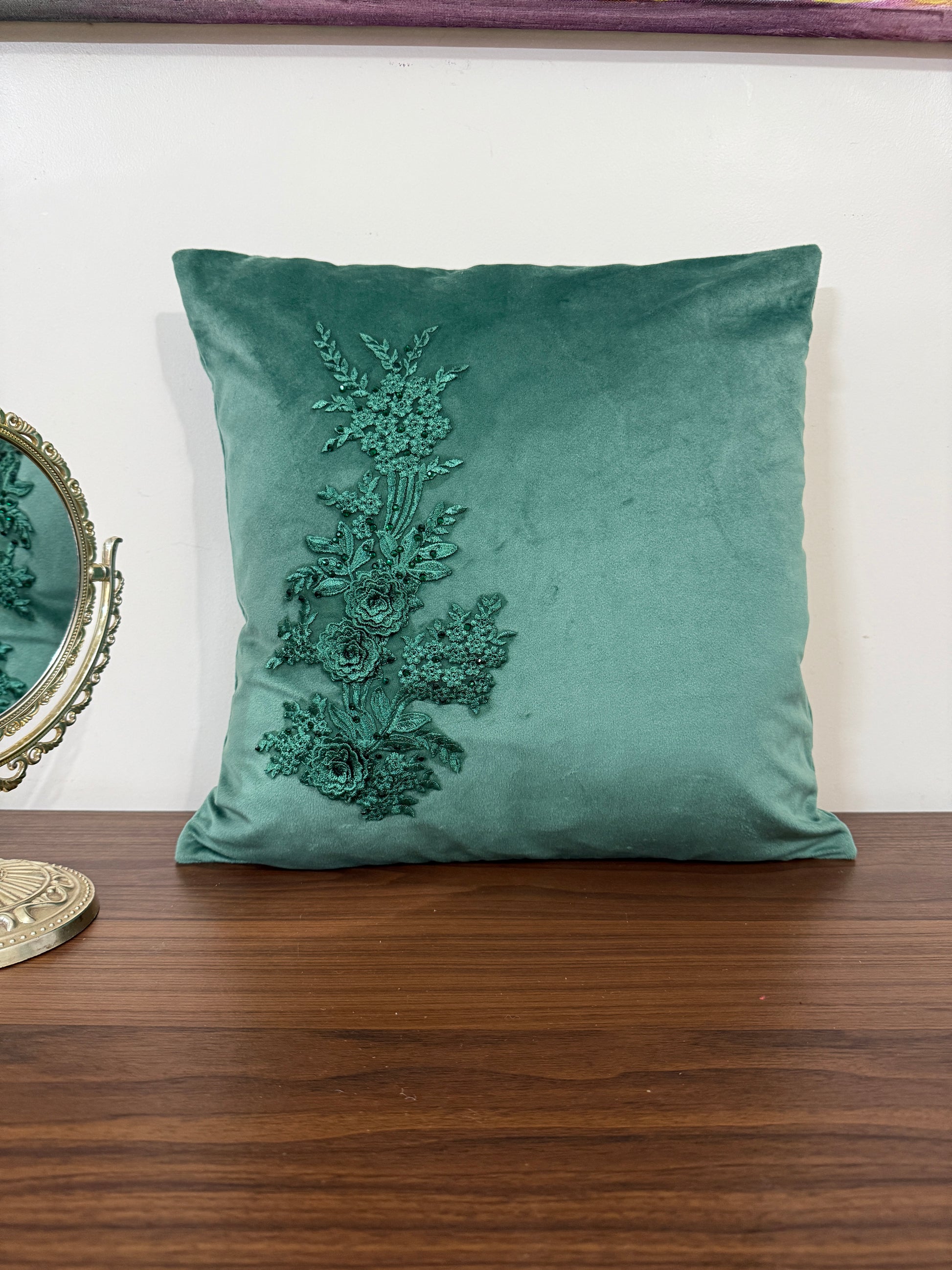 Elevate your interior décor with this jade green velvet cushion cover, featuring an intricately embellished lace motif. The luxurious velvet fabric adds a rich texture, while the detailed lace embellishment introduces a refined, expert-crafted aesthetic. Perfect for enhancing both modern and classic settings, this cushion cover combines elegance and tactile comfort to subtly transform your living space.
