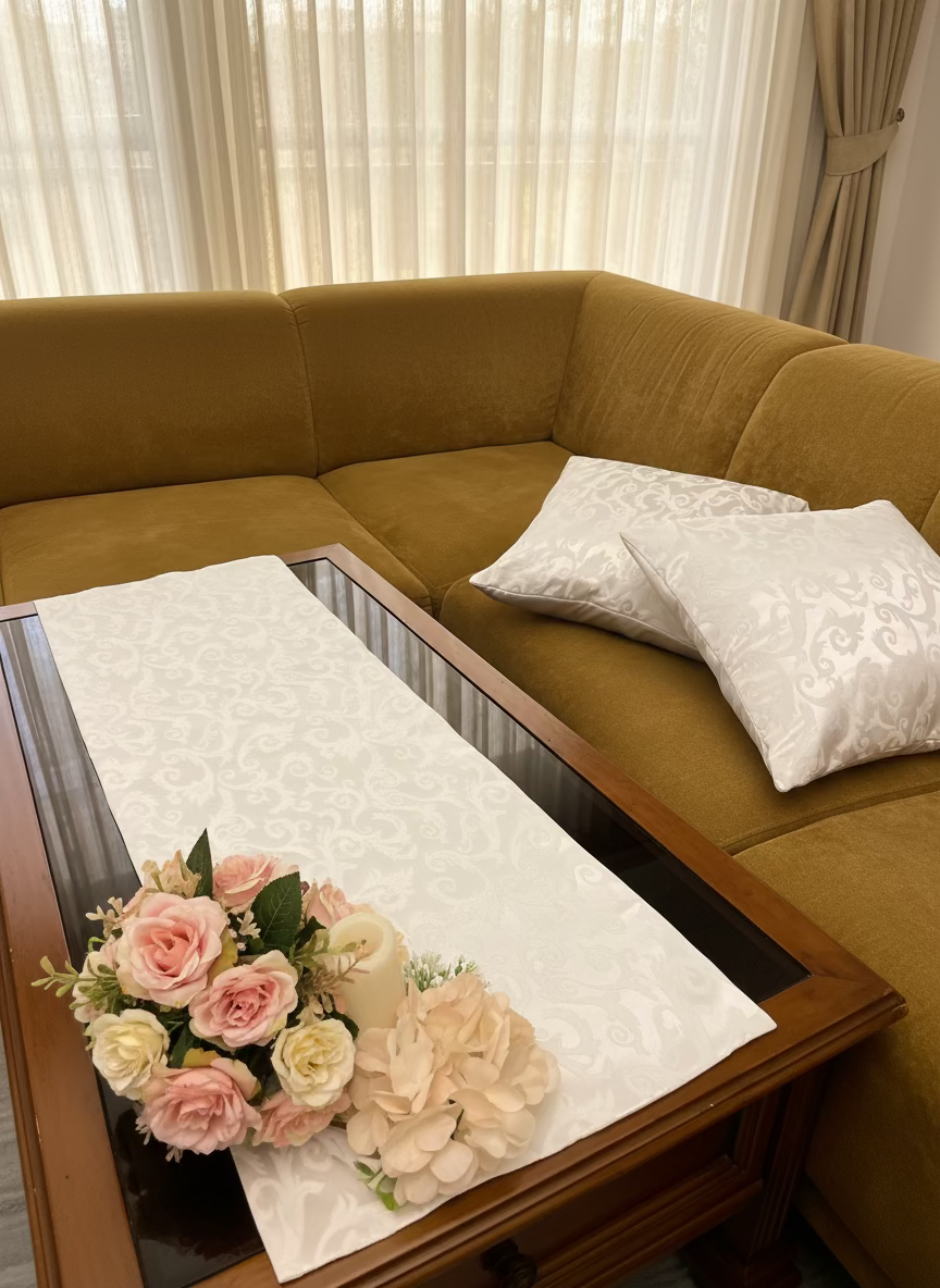 This sophisticated off-white satin with a self-printed design adds subtle visual interest This set includes a luxurious table runner and two matching cushion covers, crafted from premium satin fabric. Perfect for, sofasor accent styling, the neutral tone complements any interior aesthetic. Ideal for both everyday elegance and special occasions, this versatile ensemble brings refinement to any room.